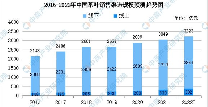 中国产业研究院数据显示,线上茶叶销售增速迅猛,由2016年的148亿元增加至2021年的330亿元,复合年增长率为17.4%,预计2022年中国茶叶市场线上销售渠道收益将达382亿元。尽管茶叶线上销售占比依然偏低,但现在已经成为重要的组成部分,且成为影响和制约茶叶单价的重要因素。