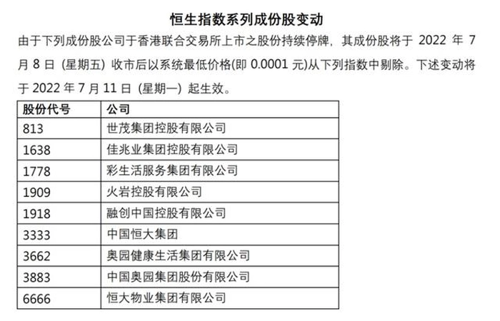 7月11日,恒世茂、兆佳业、融创、恒大、奥园中国五大知名地产开发商以及两家物管公司奥园健康、恒大物业,被以0.0001元的系统最低价格,正式剔除出恒生指数。