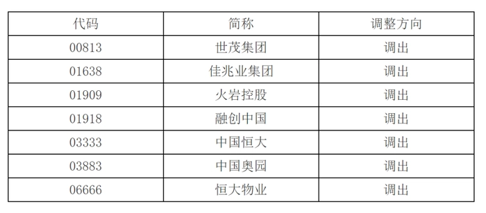 深交所发布《关于深港通下的港股通标的证券名单调整的公告》,称因恒生综合大型股指数、中型股指数、小型股指数实施成份股调整,将世茂、佳兆业、融创、恒大、奥园这五家房企以及恒大物业调出港股通标的证券名单。