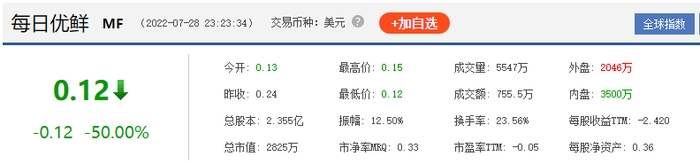 截止7月28日盘中,每日优鲜股价暴跌50%,仅剩下0.12美元/股。以2021年6月25日上市的发行价13美元/股计算,市值蒸发了99%。