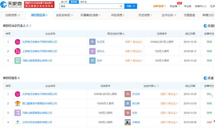 目前,每日优鲜联合创始人曾斌共有20家关联企业,其中有6家显示为注销,存续状态的有14家,其中包括北京每日优鲜技术有限公司、天津每日优鲜电子商务有限公司等,在14家存续的公司中,曾斌担任5家公司的法人代表,但在份量最重的每日优鲜却变更了法人代表的身份,这种高层身份的变更也引发业界联想。