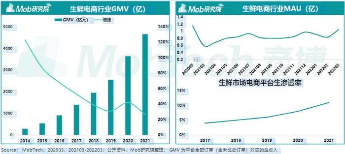 最新行业研究数据表明,2022年生鲜电商的GMV超过4000亿元,涌现出每日优鲜、叮咚买菜、多多买菜、美团优选等生鲜电商巨头,但因其市场竞争激烈,现阶段已经增速平缓。月活保持在1亿左右,随着疫情的反复出现波动。目前生鲜购买场以传统菜市场为主,生鲜平台渗透率待提升。