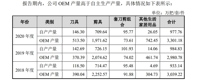 除研发费用和销售费用的“失调”外,张小泉的招股说明书暴露出更令人惊讶的问题,2018年至2020年,张小泉OEM产品产量分别为3039.22万件、2980.78万件及3301.18万件,分别占全部产量的76.51%、75.17%、77.15%。也就是说,我们买到的张小泉大概率是由代工厂生产。