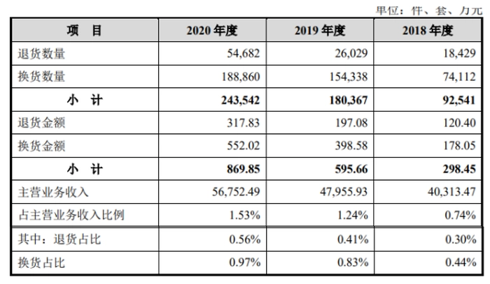 代工生产的产品质量参差不齐,张小泉遭遇退换货的事件也越来越多。2018年至2020年,张小泉退换货数量分别为9.25万件/套、18.04万件/套、24.35万件/套;涉及的退换货金额分别为298.45万元、595.66万元和869.85万元,占主营业务收入的比例分别为0.74%、1.24%及1.53%。