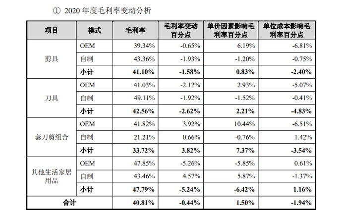 据财报显示,2018年至2020年,张小泉主营业务成本分别为25556.71万元、28172.65万元、33590.16万元,其中OEM产品成本分别为15541.77万元、17474.62万元和23384.07万元,分别占当期主营业务成本的60.81%、62.03%和69.62%,从毛利率变动分析情况中也不难看出,剪具、刀具两大主力产品的自制生产更加经济实惠。
