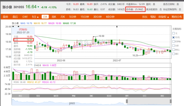 2021年9月6日,张小泉以发行价6.9元/股的价格登陆创业板,截至首日收盘,股价达到33.59元/股,涨幅324.84%,市值达53.18亿。如今不到一年,公司市值已缩水过半,截至“断铲事件”当日收盘(7月29日),张小泉股价跌至16.64元/股,市值仅剩25.96亿元。甚至有不少股民苦中作乐,戏称张小泉的股票为“股票刺客”、“股价断魂刀”。