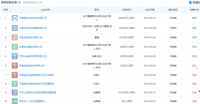王琳注销的7家企业,均是食品相关的中小企业,注册资金最高的为河南益圣多食品有限公司,注册资金仅为200万元,随后王琳像开了挂一样,企业由500万元到1000万元再到天津金邦投资发展有限公司的1亿元和真实生物的8亿元。