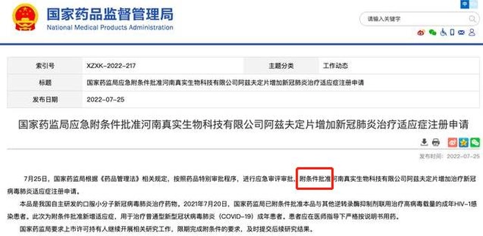 7月25日,国家药监局根据《药品管理法》相关规定,按照药品特别审批程序,进行应急审评审批,批准河南真实生物科技有限公司阿兹夫定片增加治疗新冠病毒肺炎适应症注册申请。