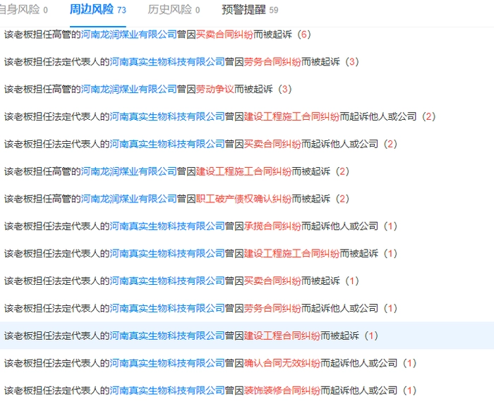 而通过天眼查周边风险可知,王琳担任高管的河南龙润煤业有限公司被列为失信人,这也是王琳在5家存续的企业中唯一没有担任法人代表的,王琳担任法人代表的真实生物也多次被起诉,王琳成了谜一样的神秘人物。