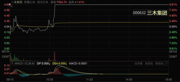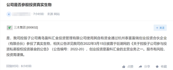 而三木集团在5月10日在回答投资者问中承认了间接持股真实生物,此消息一出,录得三个涨停。