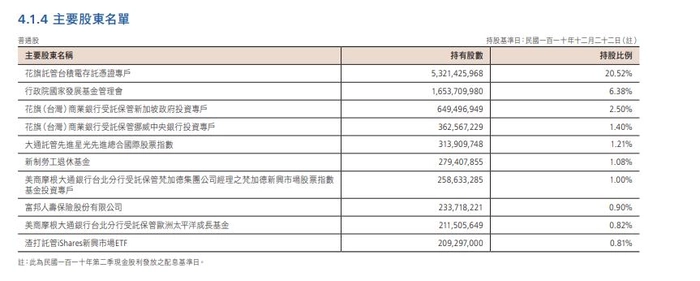 据台积电2021年年报主要股东名单显示,花旗托管台积电存托凭证专户,持股比例为20.52%,排在第一位;其次是中国台湾的“行政院国家发展基金管理会”,持股6.38%;花旗商业银行受托保管新加坡政府投资专户,持股2.50%;花旗商业银行受托保管挪威中央银行投资专户,持股1.40%;大通托管先进星光先进综合国际股票指数,持股1.21%;新制劳工退休基金,持股1.08%。