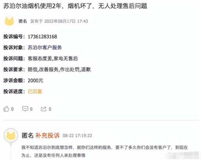 新消费行业分析师马慧敏表示,大品牌都可能存在店大欺客的现象,主要是全国销量太多,有时候会有众口难调的情况出现,销量大,同时也存在投诉量大的风险,但对一家注重自身品牌的企业来说,会比较在意用户的投诉诉求,像苏泊尔等品牌这样较低的投诉完成率并不多见。
