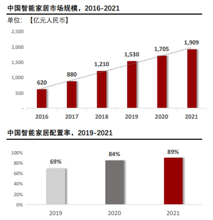 从需求侧来看,据头豹研究院数据,2021年中国智能家居市场规模增加至1909亿元,智能家居配置率达到89%,科技赋能绿色家居成为重要趋势。