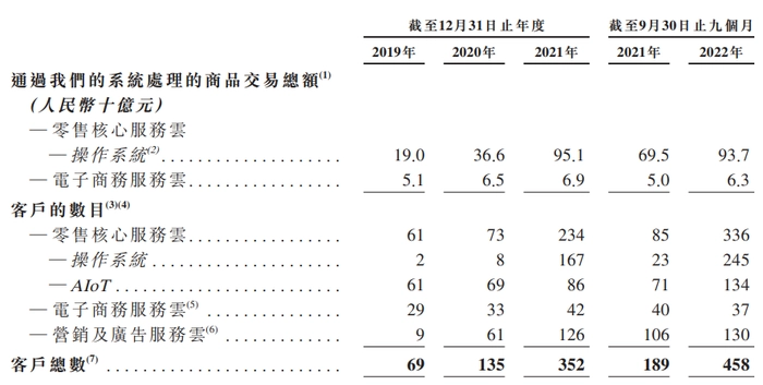 招股书显示,零售核心服务云的收入及占比都在逐年增长,2019年至2022年前九个月,收入分别为8943万元、1.98亿元、4.39亿元以及6.4亿元,总收入占比分别为33.8%、40.7%、42%、58.1%,已经过半。