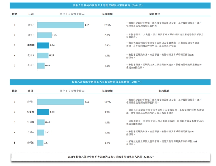 多点在招股书中表示,根据弗若斯特沙利文的资料,按商品交易总额计算,多点目前是中国及亚洲最大的零售云解决方案数字零售服务商,截至2021年12月31日的市场份额分别为14.8%及9.0%。