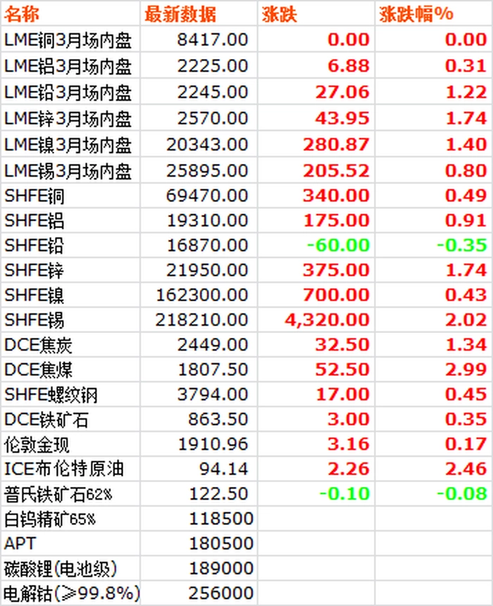 9月14日,LME六种基本金属价格全线上涨,高位窄幅拉锯后小幅收高,锌镍铅涨幅居前。三月期锌价继续领涨大盘,收于2570,上涨1.74%。三月期镍价收于20343,上涨1.4%。三月期铅价收于2245,上涨1.22%。三月期锡价收于25895,上涨0.8%。三月期铝价收于2225,上涨0.31%。三月期铜价围绕8400上下窄幅拉锯后收于8417.5,基本持平。