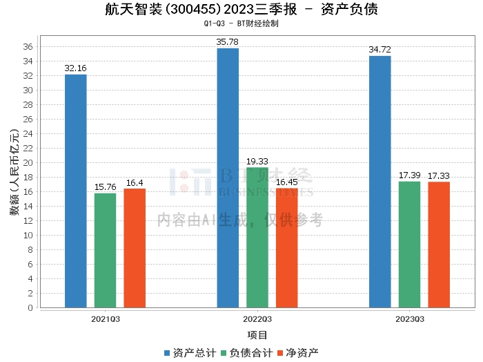 从资产负债方面来看,航天智装2023年三季度的总资产为34.72亿元,相比上年度末的35.3亿元有所下降,负债合计为17.39亿元,相比上年度末的18.22亿元有所减少。净资产为17.33亿元,相比上年度末的17.08亿元有所增加。资产负债率为50.08%,相比上年度末的51.62%有所下降。这些数据表明,公司的负债规模在逐渐减小,资产负债率也在下降,整体资产状况良好。