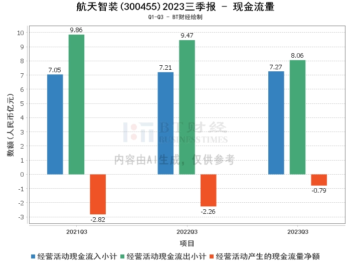 在现金流量方面,航天智装2023年三季度的经营活动现金流入小计为7.27亿元,相比上年同期的7.21亿元有所增加,经营活动现金流出小计为8.06亿元,相比上年同期的9.47亿元有所减少。这些数据表明,公司的经营活动现金流入有所增加,现金流出有所减少,现金流量状况整体良好。