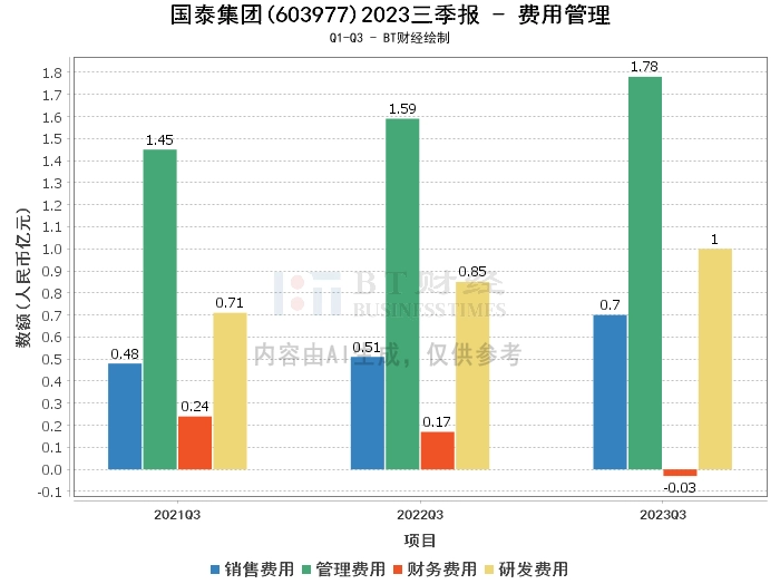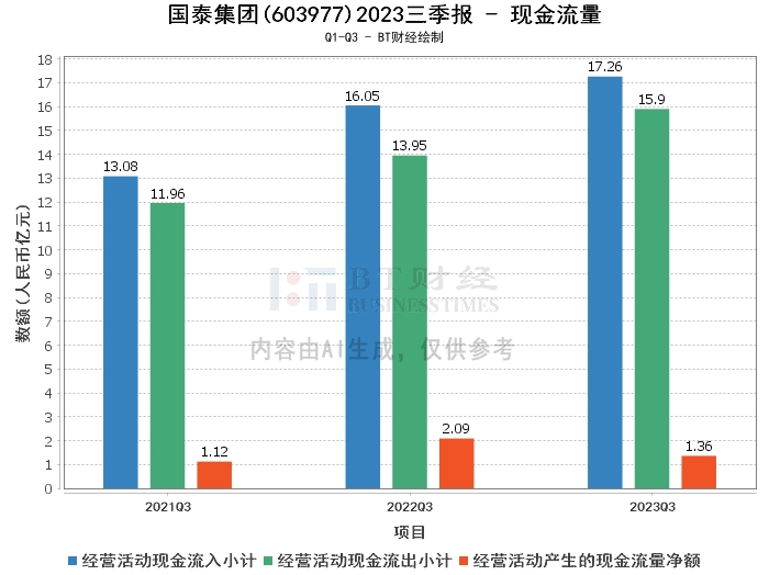 在现金流量方面,国泰集团2023年三季度的经营活动产生的现金流量净额为1.36亿元,相比上年同期的2.09亿元下降35.18%。经营活动现金流入小计为17.26亿元,相比上年同期的16.05亿元增长7.53%。经营活动现金流出小计为15.9亿元,相比上年同期的13.95亿元增长13.98%。这些数据显示,公司的经营活动产生的现金流量净额有所下降,主要系收到税收返还的减少和支付各项税费的增加所致。