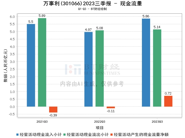 在现金流量方面,2023年三季度,万事利的经营活动产生的现金流量净额为7194.05万元,相比上年同期的-1108.96万元,实现了由负转正的变化。经营活动现金流入小计为5.86亿元,相比上年同期的4.97亿元,增长了17.91%。经营活动现金流出小计为5.14亿元,相比上年同期的5.08亿元,增长了1.18%。这些变动主要是由于本期销售增加,销项税相应增加,以及本期收到政府补助减少所致。