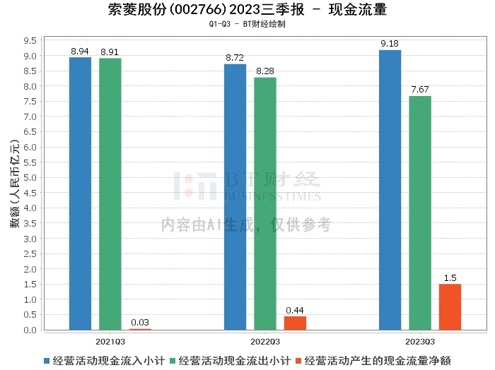 在现金流量方面,索菱股份2023年三季度的经营活动产生的现金流量净额为1.5亿元,相比上年同期的4404.17万元有显著增长。经营活动现金流入小计为9.18亿元,相比上年同期的8.72亿元有所增加。经营活动现金流出小计为7.67亿元,相比上年同期的8.28亿元有所减少。