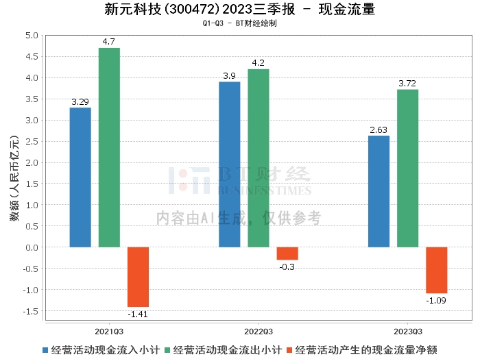 在现金流量方面,新元科技2023年三季度的经营活动现金流入为2.63亿元,较上年同期的3.9亿元有所减少。经营活动现金流出为3.72亿元,较上年同期的4.2亿元有所减少。