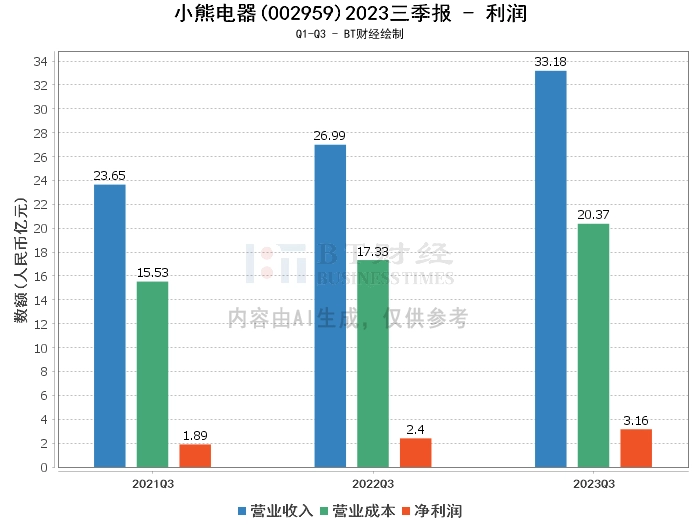 在利润方面,小熊电器2023年三季度的营业收入为33.18亿元,相比上年同期的26.99亿元有所增长。营业利润为3.4亿元,相比上年同期的3.13亿元有所增长。营业成本为20.37亿元,相比上年同期的17.33亿元有所增长。净利润为3.16亿元,相比上年同期的2.4亿元有所增长。