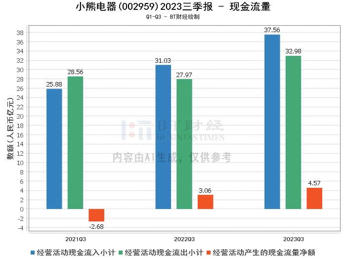 在现金流量方面,小熊电器2023年三季度的经营活动产生的现金流量净额为4.57亿元,相比上年同期的3.06亿元有所增长。经营活动现金流入小计为37.56亿元,相比上年同期的31.03亿元有所增长。经营活动现金流出小计为32.98亿元,相比上年同期的27.97亿元有所增长。