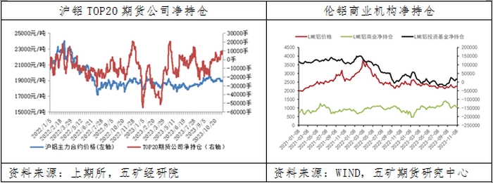 11月20日,沪铝持仓量TOP20期货公司持仓由上月净多头28手扩大至10005手。9月中旬至11月中旬,国内主力持仓呈现“高抛低吸”特征,在价格上涨至平台上沿时显著增加空头敞口,在价格回落后扩大多头敞口。11月10日,伦铝商业机构持有净空头141554手,较上月同期空头敞口收缩4652手,投资基金持有净多头16008手,较上月同期多头敞口收缩7195手。