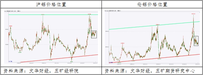 四、沪铝和伦铝分别处在长期价格区间中部和中部偏下位置