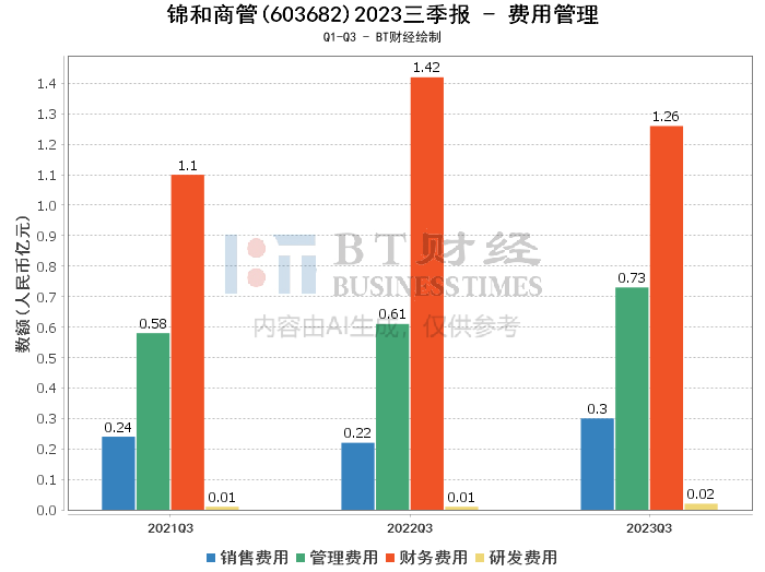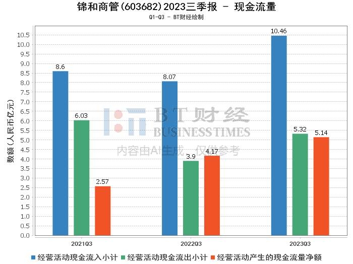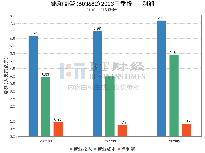 综上所述,锦和商管在2023年三季度的总体经营状况呈现出稳步增长的态势。公司在营业收入和净利润上均实现了增长,现金流量净额的增加也为公司的日常运营提供了更强的资金支持。然而,负债水平的上升和资产负债率的增加以及营业成本的显著增长,也反映出公司在运营过程中面临的挑战。