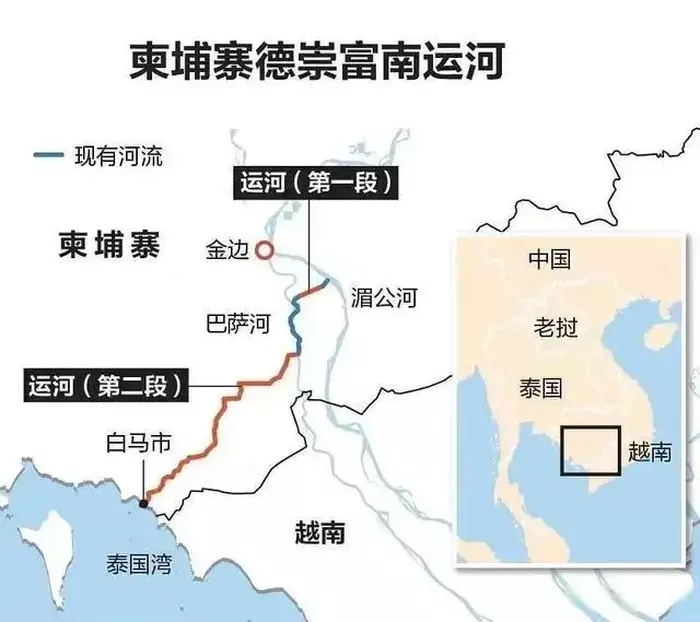 据澎湃等媒体报道,柬埔寨德崇富南运河项目是柬埔寨国家级战略工程,首相洪马内多次公开表示这是关乎柬埔寨前途命运的工程,该工程全长180公里,预计建设周期为四年,总投资约17亿美元。运河起点为柬埔寨首都金边的东南方向,途经甘丹、茶胶、贡布和白马四大区域,终点为白马。富南运河一旦成功通航,将最少有150万人从中受益,改变了柬埔寨境内无规模贸易航道的历史。每年最少能为柬埔寨带来30亿元以上的经济收入。