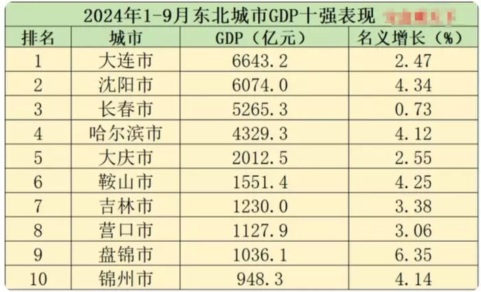 但在整个东北GDP十强市中,哈尔滨的2024年前三季度GDP增速低于盘锦、沈阳、鞍山和锦州,位列第五位,经济体量差距也被第一的大连拉大至2313.9亿元,在东北主要四市中垫底,落后排名第三的长春936亿元。虽然和身后的大庆市体量差距巨大,暂时不会被其反超,但想在东北四市中排名上提也不现实。