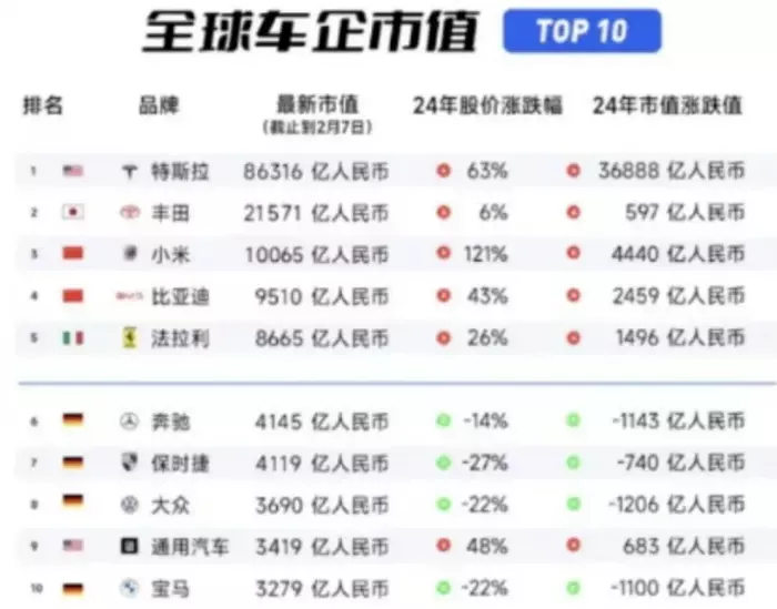 进入2025年小米股价就一路上行,累计涨幅已超过20%。全球范围来看,小米市值仅次于特斯拉的8.63万亿元和丰田的2.15万亿元,在全球市值最高的汽车企业中排名中高居第三,将奔驰、宝马等一众知名车企踩在脚下。据富途全球榜单所示,小米集团已经从“最年轻的世界500强企业”,正式迈入全球100强企业名单,超越波音、招商银行等巨头。