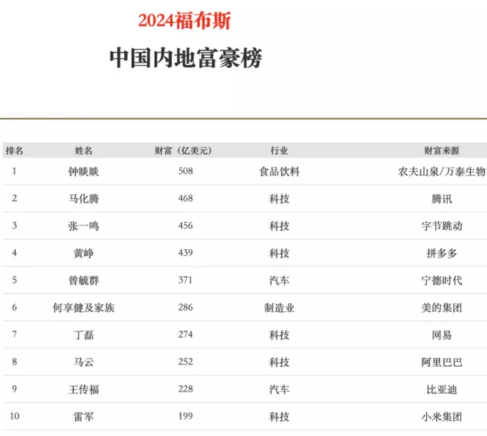 雷军一直是被低估的超级富豪。2024年的中国内地富豪榜排名中,雷军以199亿美元的财富勉强挤进前十。落后第九位王传福近30亿美元,更是落后榜首钟睒睒309亿美元。这么看雷军其实财富不及首富钟睒睒的一半,甚至不及2到4名马化腾、张一鸣和黄铮的一半,首富宝座看起来依然遥远。
