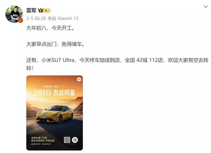 大年初八早上6:25分,雷军在微博发文称“已经开工”,在初七中午,雷军微博已经为小米新车造势,“小米SU7 Ultra,从2月5日起,全国42城112店已有样车,专属产品专家 Ultra Master 将为您开启静态品鉴!”