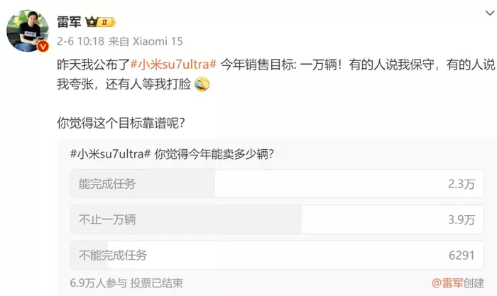 雷军甚至不满足在中低端车型的“小打小闹”,开始推出售价高达81.49万元的小米SU7 Ultra,雷军给小米SU7 Ultra的销量目标为一年1万辆。微博上共有超过6.8万人对该目标进行投票,结果只有6291人认为雷军不能完成任务,有3.9万人认为小米SU7 Ultra年内销量不止一万辆。