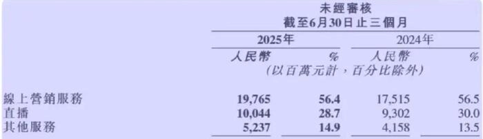 快手的营收构成主要由三大部分组成,分别为线上营销服务、直播和其他服务(电商),其中线上营销服务营收为197.7亿元、直播营收100.4亿元和电商等其他服务的52.4亿元,同比分别增长13%、8%、26%。