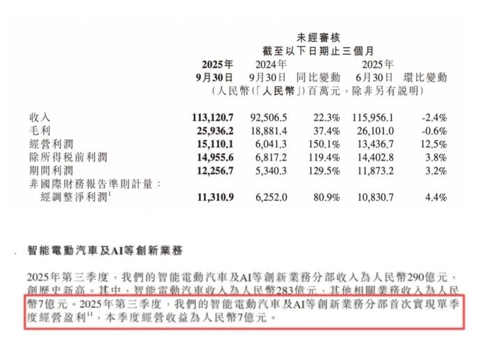 小米集团最新发布的财报显示,第三季度小米集团总收入达1131亿元,同比增长22.3%,连续4个季度突破千亿;经调整净利润为113亿元,同比大增80.9%,创历史新高。最引人关注的还是小米的汽车业务,汽车业务及AI等创新业务三季度收入飙升至290亿元,同比增长199.2%。其中智能电动汽车收入283亿元,同比去年的同期的95亿元增长197.9%,经营收益为7亿元。第三季度小米汽车的总销量为108796辆,这意味着如今小米的单车净利润达6434元。