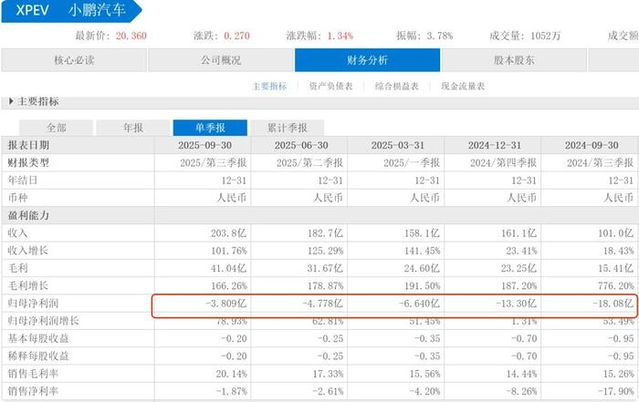 小鹏在智驾和双能源战略X9超级增程车型预售火爆,以及MONA M03单月交付超1.5万辆,G6累计交付6.5万辆的规模优势,加上费用优化,2025年Q3小鹏汽车综合毛利率突破20%,净亏损收窄至3.8亿元,汽车毛利率达13.1%,今年第四季度有望盈利。近四个季度净亏损分别为13.3亿元、6.64亿元、4.778亿元和3.8亿元,亏损收窄明显。