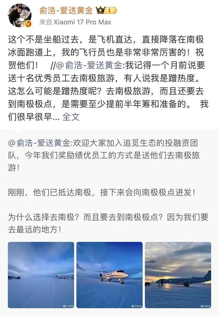 还有一家造扫地机器人的企业追觅科技,也因年会上了热搜。追觅科技创始人俞浩1月24日在社交媒体发文称送十名员工去南极游,并声称“追觅今年的年会,打算直接变成请大家看演唱会,自己员工自己宠”。随后在微博发文表示,将加码抽取10000张演唱会门票。2月4日追觅科技在苏州奥林匹克体育中心举办《敢梦敢为追觅之夜》演唱会,这是一场高规格的年会,“这场与央视联合主办的盛大庆典,是追觅为全体员工打造的一场新式年会。”
