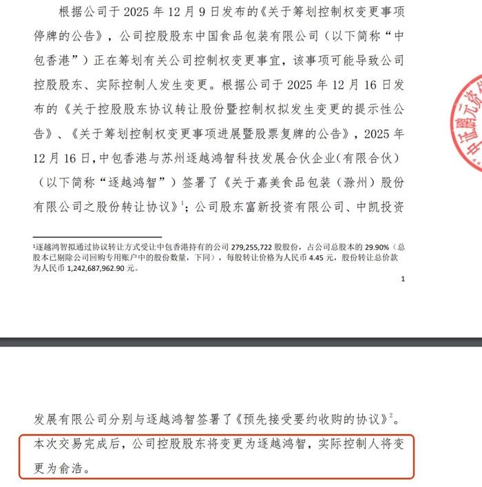 2025年12月18日A股上市公司嘉美包装发布公告称公司实际控制人变更为俞浩。俞浩通过其控制的持股平台苏州逐越鸿智,以“协议转让+主动要约”组合方案收购嘉美包装。首先以每股4.45元价格协议受让原控股股东29.90%股份,完成控制权交割。随后向其余股东发起部分要约收购,计划再收购25%股份。若全部完成,最终持股比例可达54.90%,总对价约22.82亿元。