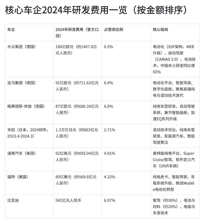 仅2024年,比亚迪研发投入达542亿元,超过特斯拉(约460亿元),成为全球研发投入最高的新能源车企。在全球车企研发投入排名中,比亚迪位列第七,紧追第六名福特,与大众、宝马、奔驰等国际巨头同处第一梯队。从研发强度看,比亚迪研发投入占营收比重达6.97%,高于大众(6.5%)、宝马(6.4%)、奔驰(6%),远超丰田的2.71%,位居全球前十车企之首。