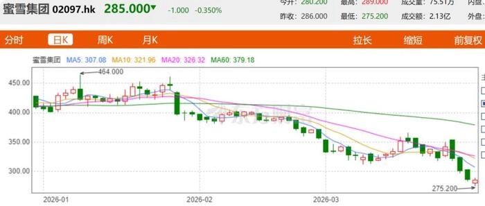 在蜜雪冰城发布财报和换帅后,其股价迎来四连跌,财报发布会的四个交易日股价跌幅达19.4%,进入2026年后,截至3月30日收盘,其股价跌幅达30.5%。以此计算,蜜雪冰城期间市值蒸发了474亿港元。若相比2025年6月618.5港元的股价高点计算,股价腰斩,市值蒸发约1100亿港元。