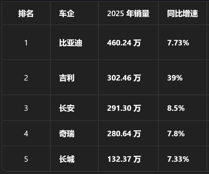 但五大车企2025年的财报一摆上桌,这个默认被打碎了——同一张桌上,比亚迪赚326亿,奇瑞赚190亿,吉利赚168亿,长城赚99亿,长安赚40亿。
