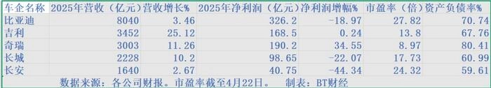 图:五大车企2025年财报核心指标对比。来源:BT财经根据各公司财报整理,市盈率截至2026年4月22日