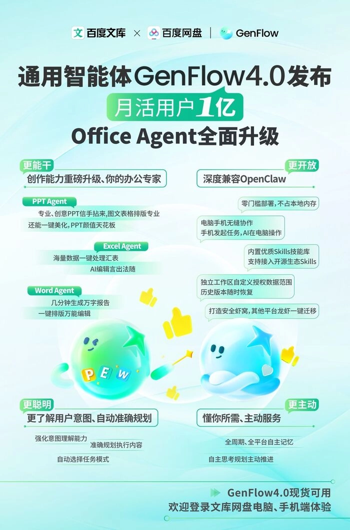 百度文库网盘发布通用智能体GenFlow4.0,全面升级Office Agent,成首个全端可用「AI工作台」