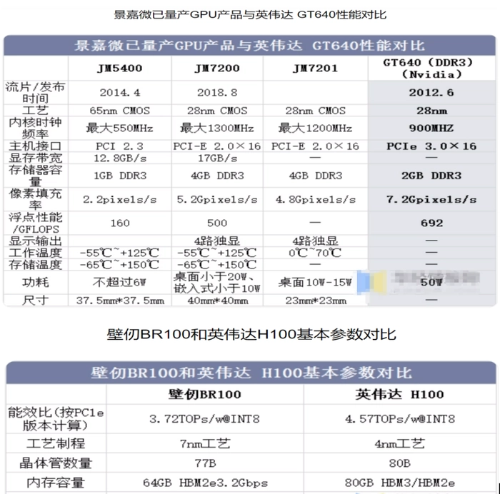 经过4轮融资的摩尔线程融资金额超过50亿元,2019年成立的壁仞科技也经过数轮融资也达50亿元左右,两家被列入“实体清单”的企业均有足够的资金用于研发。其中壁仞科技已经在2022年8月份交出其首款GP GPU BR100的答卷,从主要参数来看,算力、能效比等整体相对较高。下表是摩尔线程和壁仞科技相关产品和英伟达的参数对比。