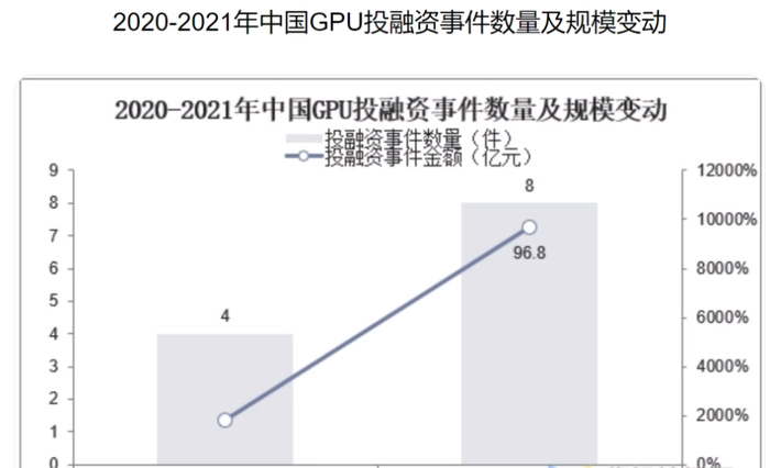 限令对国内半导体产业发展持续限制,国内GPU产业热度持续高涨,市场对于GPU国产化的期望值持续提高,带动我国GPU投融资数量及金额快速扩张,美方限令将逼迫中国企业自主研发寻求突破,从而加快我国GPU国产化进程。市场大量资本涌入GPU赛道,华经产业研究院数据显示,2020年该赛道有4件投融资事件,金额仅为1亿多元,2021年投融资事件增加至8件,金额达96.8亿元。