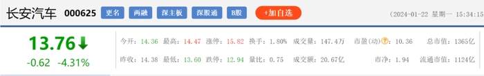 次日收盘,长安汽车收盘股价为14.38元/股,收跌5.89%。截至1月22日收盘,长安汽车再度收跌4.31%,股价为13.76元。自2023年11月28日的21.48元高点至今股价已经下跌36%,市值蒸发超765亿元。